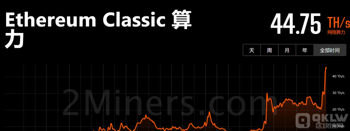 区块链网QKLW.COM记者报道:2Miners数据显示,ETC全网算力今日一度达到46.04TH/s的历史高点,目前为44.75TH/s。