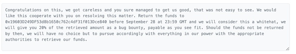 MEV机器人的所有者给攻击者发了一条信息,“祝贺”他们发现了 “难以发现”的漏洞,并为他们提供了20%的赏金以换取暂时不采取法律行动的”承诺“。该”承诺“的最后生效期限是北京时间2022年9月29日早7点59分。