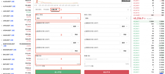 多单为例:【平仓】— 选择【止盈止损】、【双向】—输入【止盈触发价格】、【止盈委托价格】与【止损触发价格】【止损委托价格】—【数量】—点击【买入平空】。