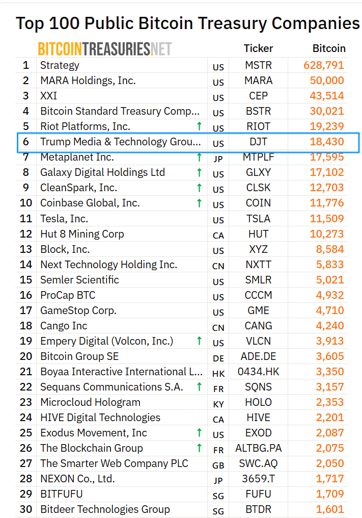 尽管亏损严重,但 Q2 财报中的一项数据格外抢眼:截至 2025 年 6 月 30 日,TMTG 的金融资产已攀升至 31 亿美元,年增幅接近 800%。其中的主因,是其比特币战略的全面推进。公司通过融资筹集了 24 亿美元专项资金用于配置加密资产,并在 7 月持有约 20 亿美元比特币资产,已跻身全球第六大比特币持仓上市公司之列。