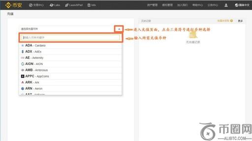 进入充值页面,点击三角符号进行币种选择,搜索所需充值币种。